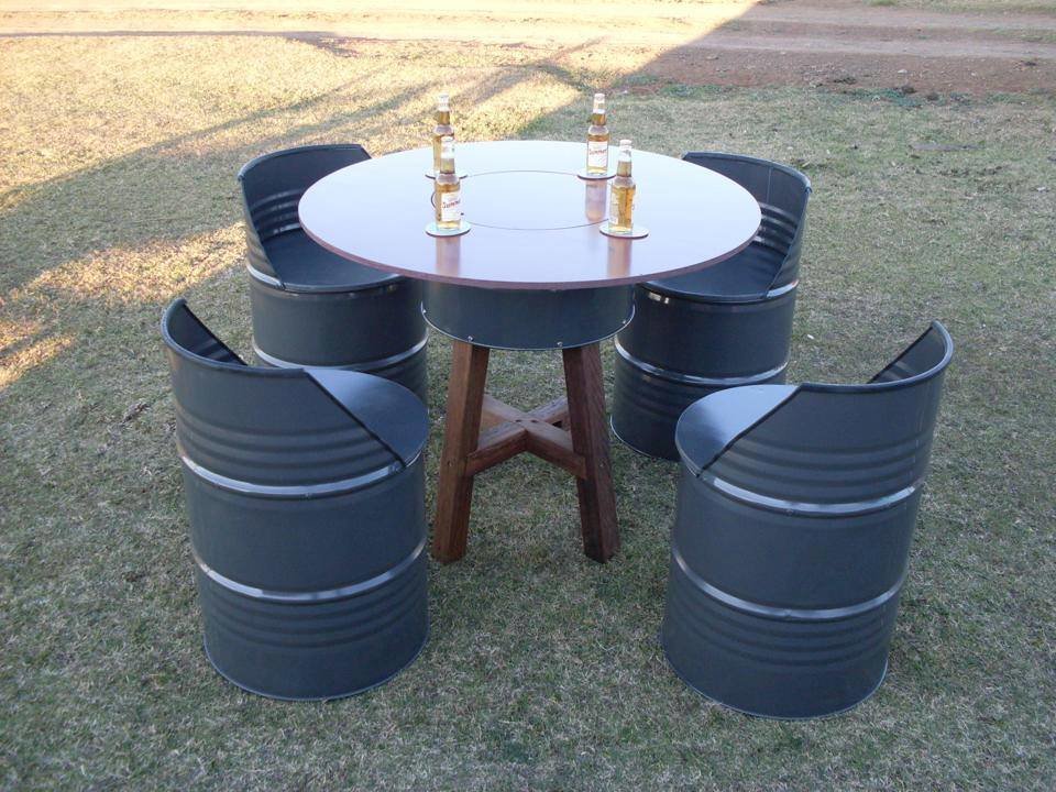 - Разместите посередине деревянную бочку и вокруг дополнительно поставьте стульчики.