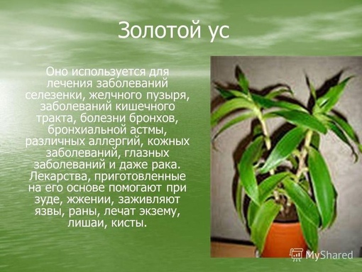 В домашних условия растение золотой ус обычно применяют для лечения воспалительных заболеваний кожи и суставов. С лечебной целью можно брать листья (размятые, чтобы появился сок) и прикладывать к ранам, ссадинам, мозолям, фурункулам.