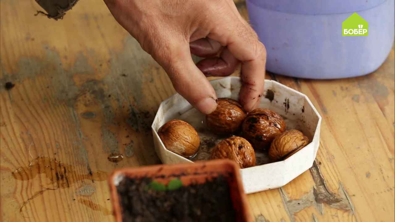 В качестве посадочного материала выбирают орехи, которые сами упали с дерева. Подходят самые крупные, без трещин, повреждений и темных пятен. Чтобы проверить на всхожесть, их кладут в воду и берут те, что опустились на дно. Для ускорения проращивания верхнюю зеленую кожуру очищают, а орехи слегка подсушивают на солнце.