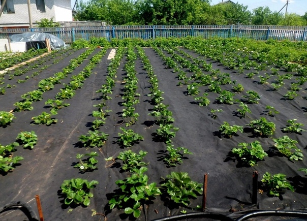 Преимущества – ягода получается довольно крупная, так как количество кустов небольшое и при этом каждое растение хорошо проветривается, и уменьшается вероятность возникновения грибковых заболеваний. - Посадка рядами. При этом варианте посадите кустики на расстоянии друг от друга приблизительно 15-20 см в один или несколько рядов, а расстояние в междурядье должно составлять около 40 см. Как и при кустовом способе посадки, также необходимо, чтобы почва была постоянно рыхлой, нужно регулярно бороться с сорняками и удалять лишние усы.